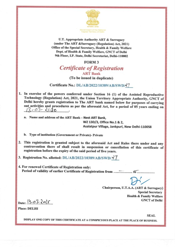 Nest ART Bank, founded in 2013 by Mr. Suresh Kumar Yadav, stands as a dedicated and reliable name in the field of assisted reproductive technology (ART) in Delhi NCR. Located in Janakpuri, New Delhi, our facility offers a wide range of fertility solutions under one roof — including frozen donor sperm, egg (oocyte) donation, surrogacy services, and personalized fertility consultation.